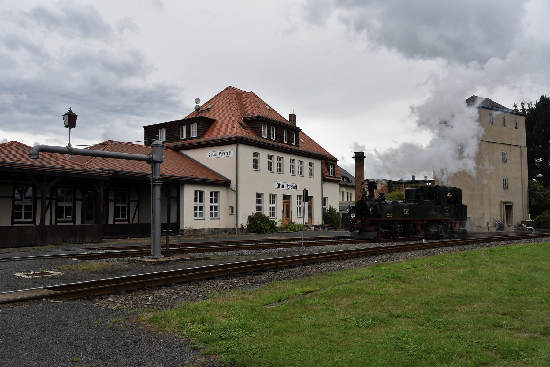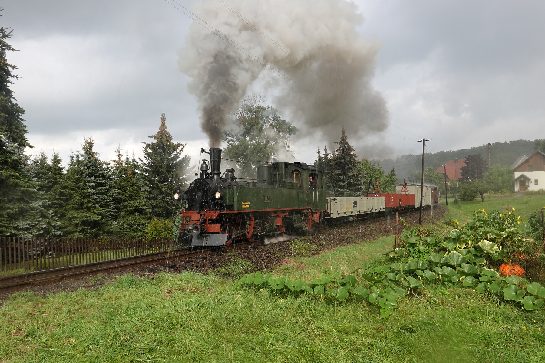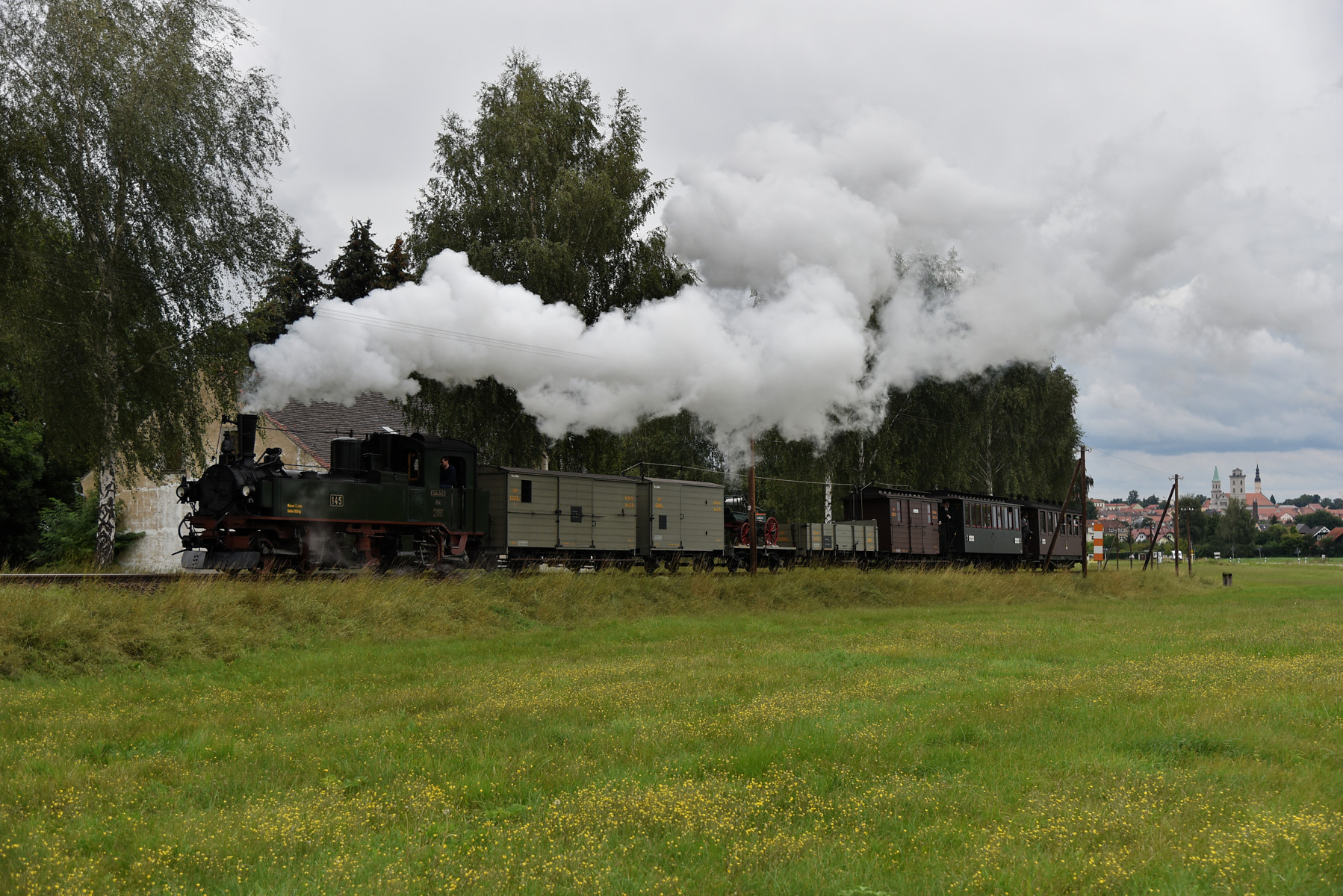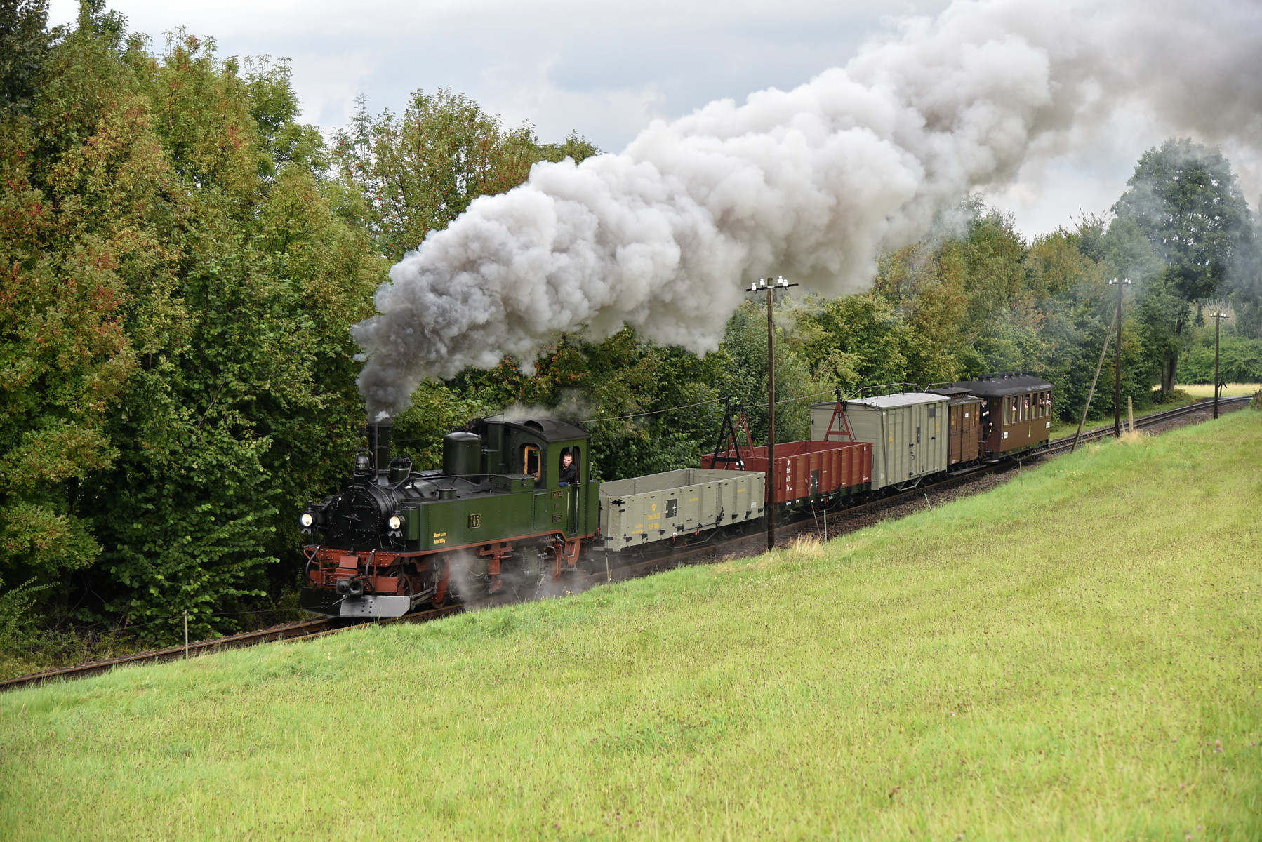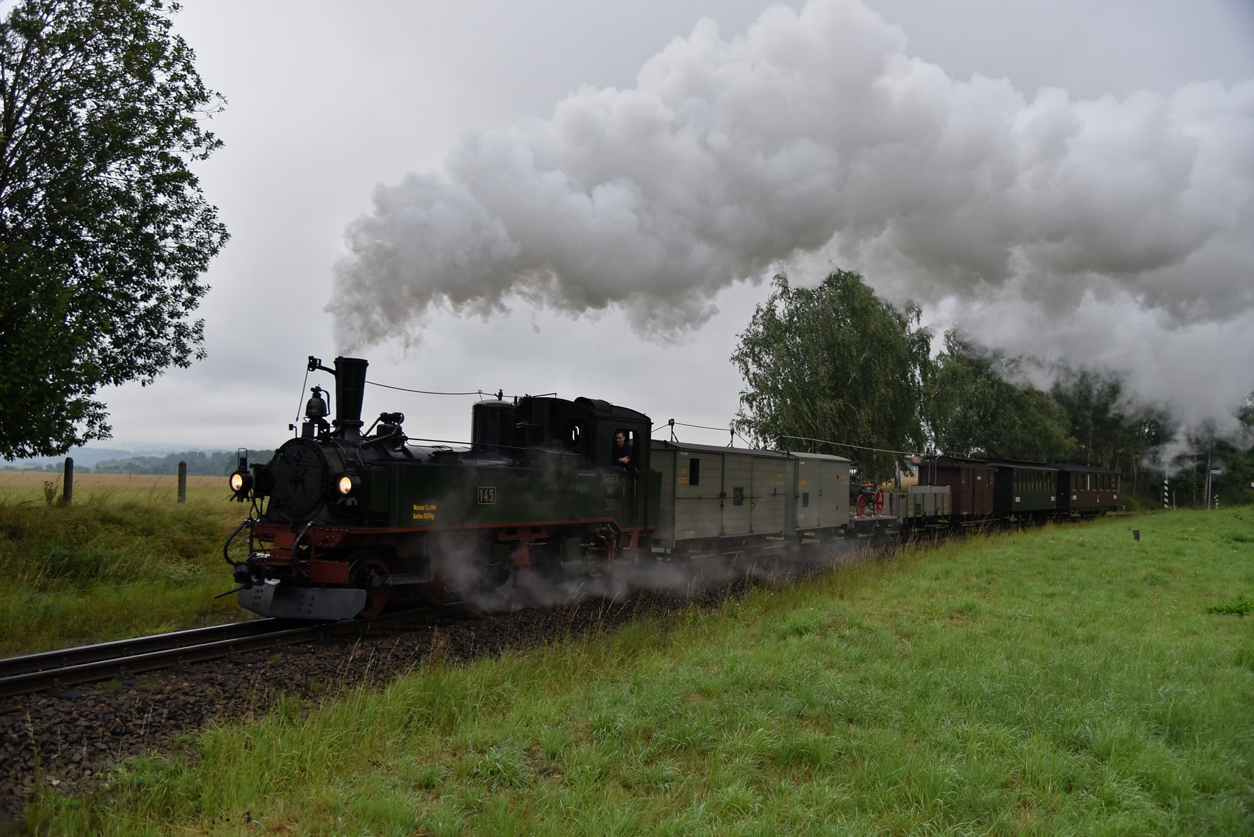 Zugfahrt mit der sächsischen Dampflok IV K Nr. 145 des Interessenverband der Zittauer Schmalspurbahnen e.V. und einem GmP mit Wagen aus der Zeit der Königlich Sächsischen Staatseisenbahn.