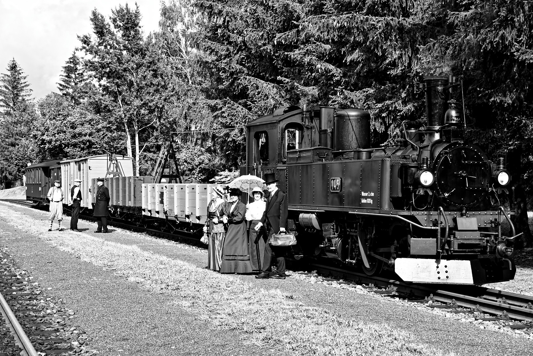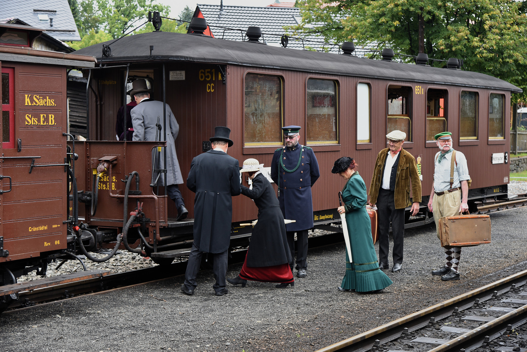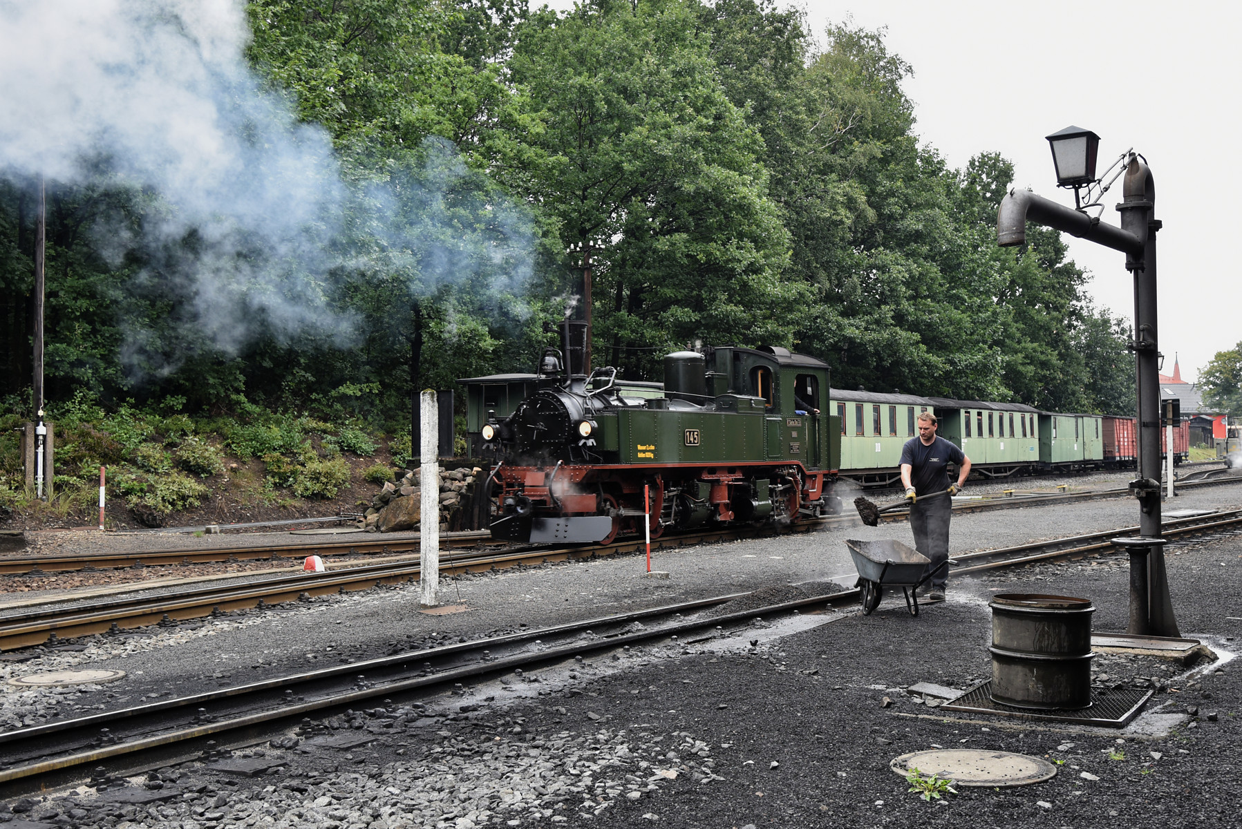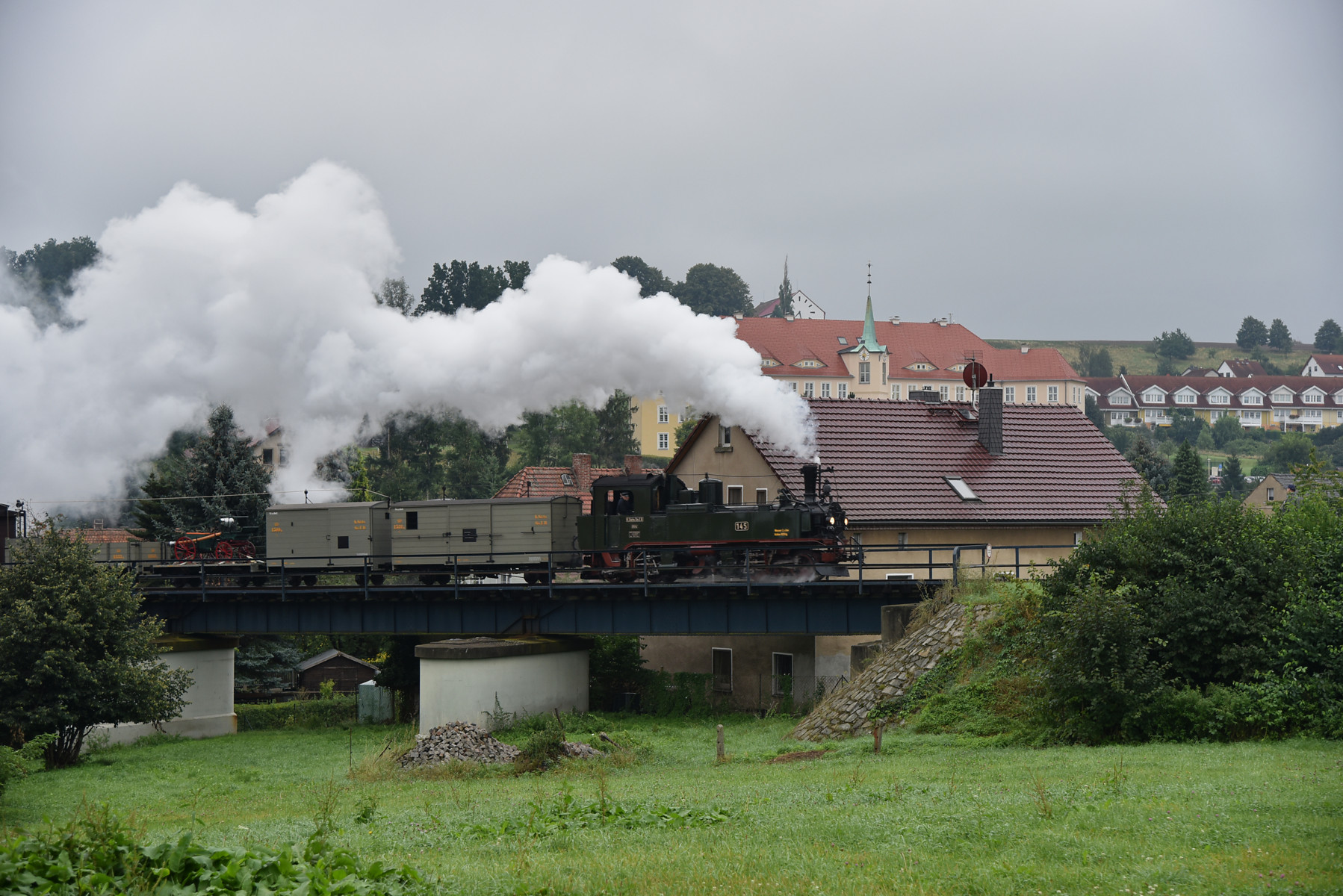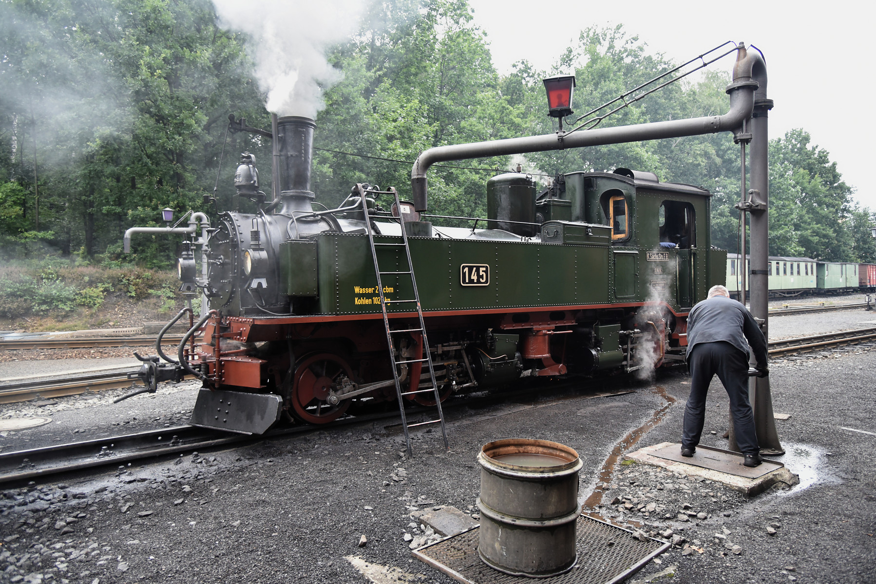 Zugfahrt mit der sächsischen Dampflok IV K Nr. 145 und einem GmP, etwas geänderte Garnitur.
