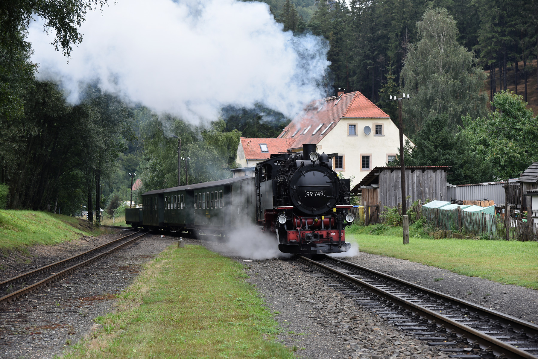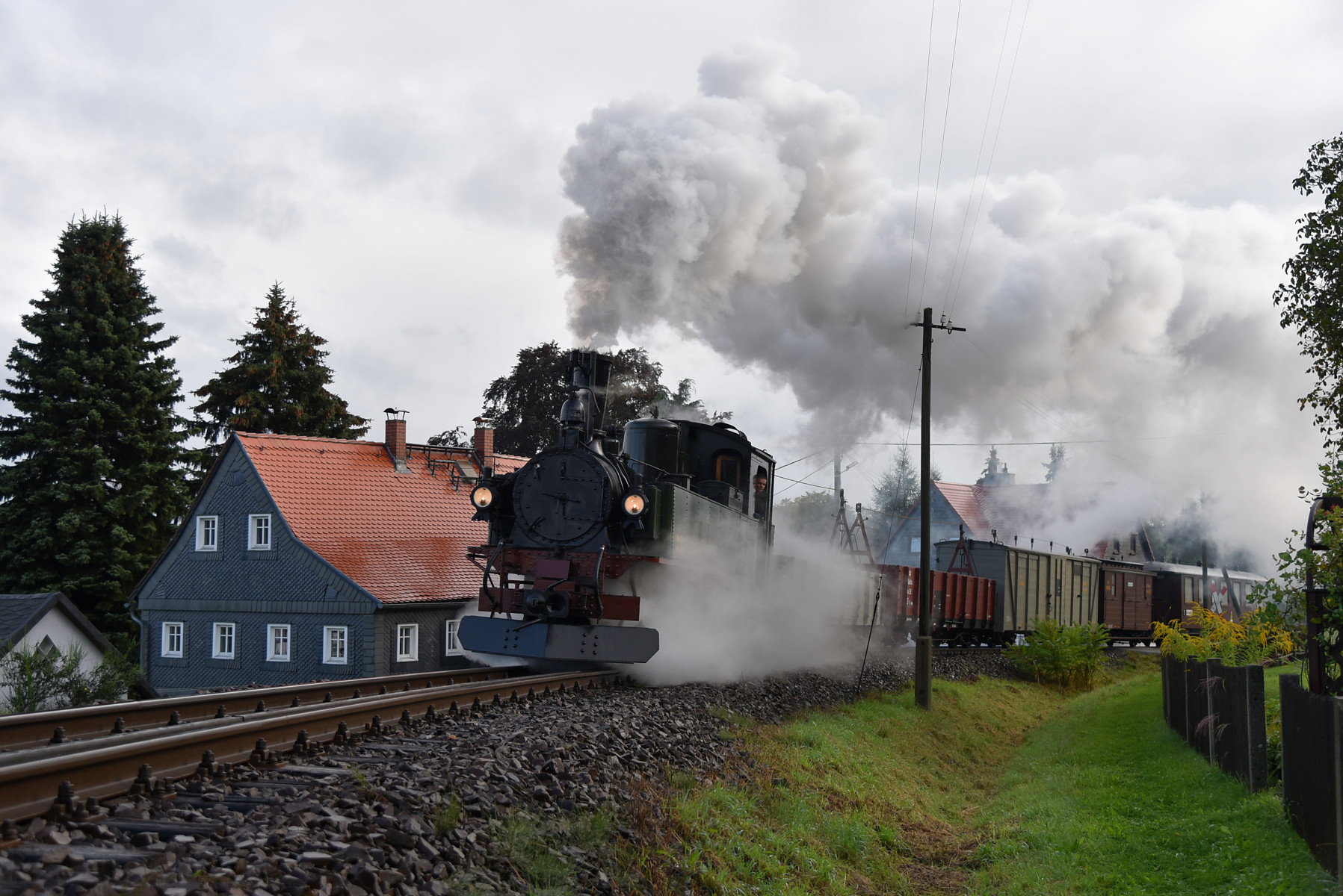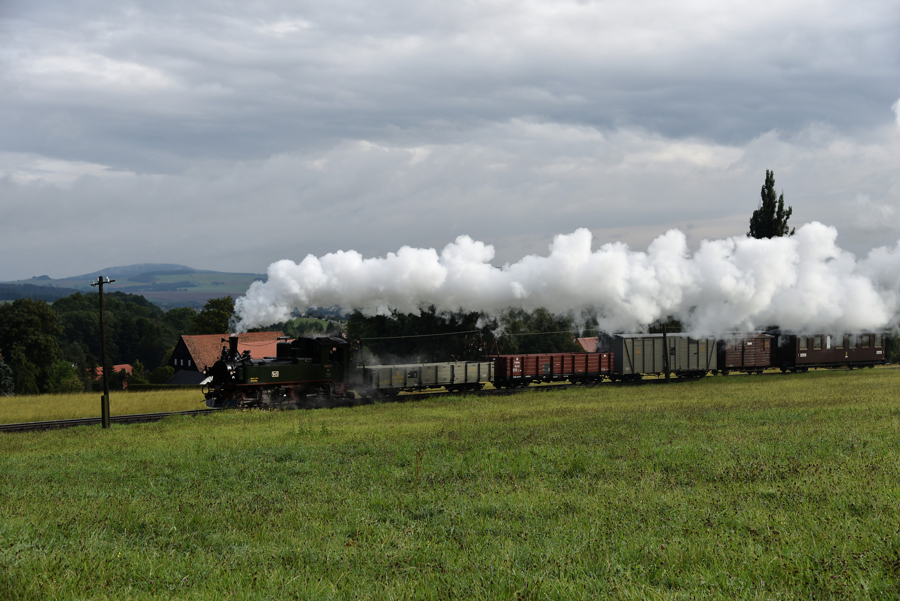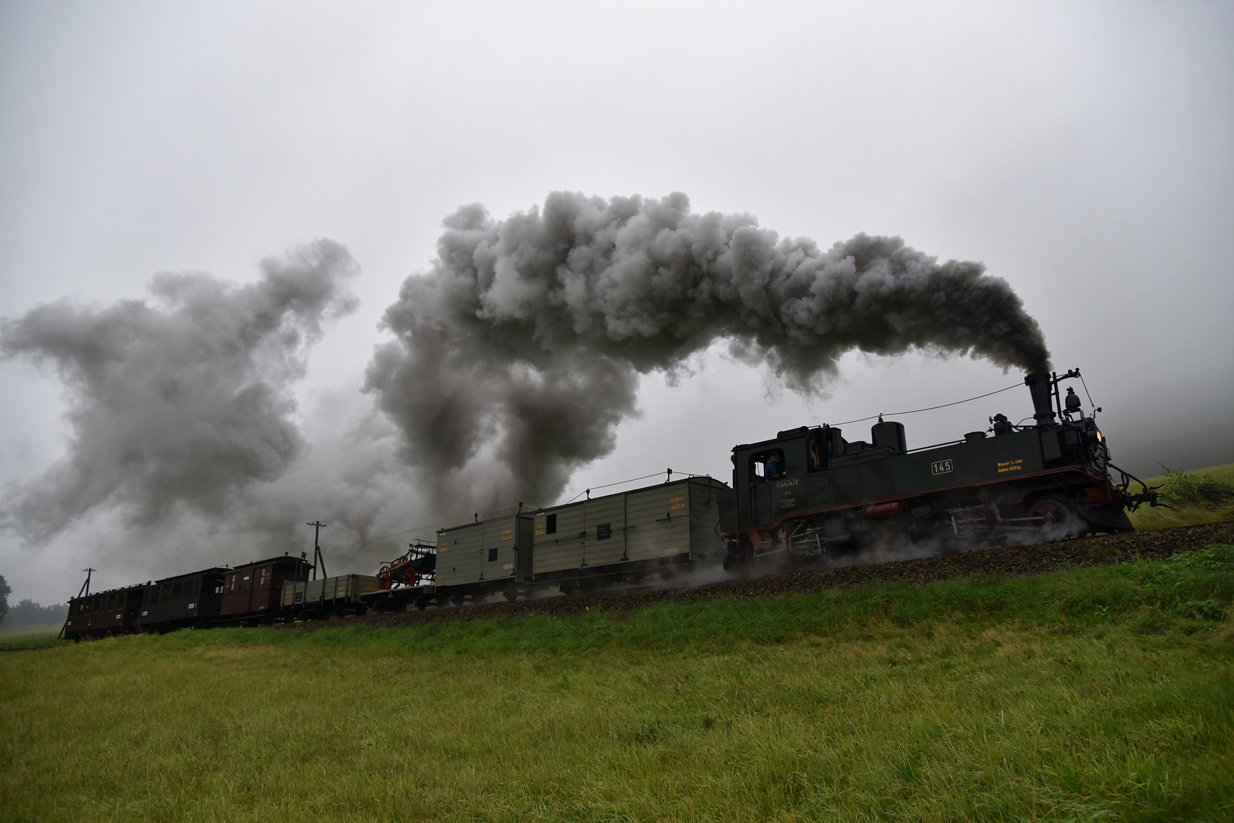 Zugfahrt mit der sächsischen Dampflok IV K Nr. 145 des Interessenverband der Zittauer Schmalspurbahnen e.V. und einem GmP mit Wagen aus der Zeit der Königlich Sächsischen Staatseisenbahn.