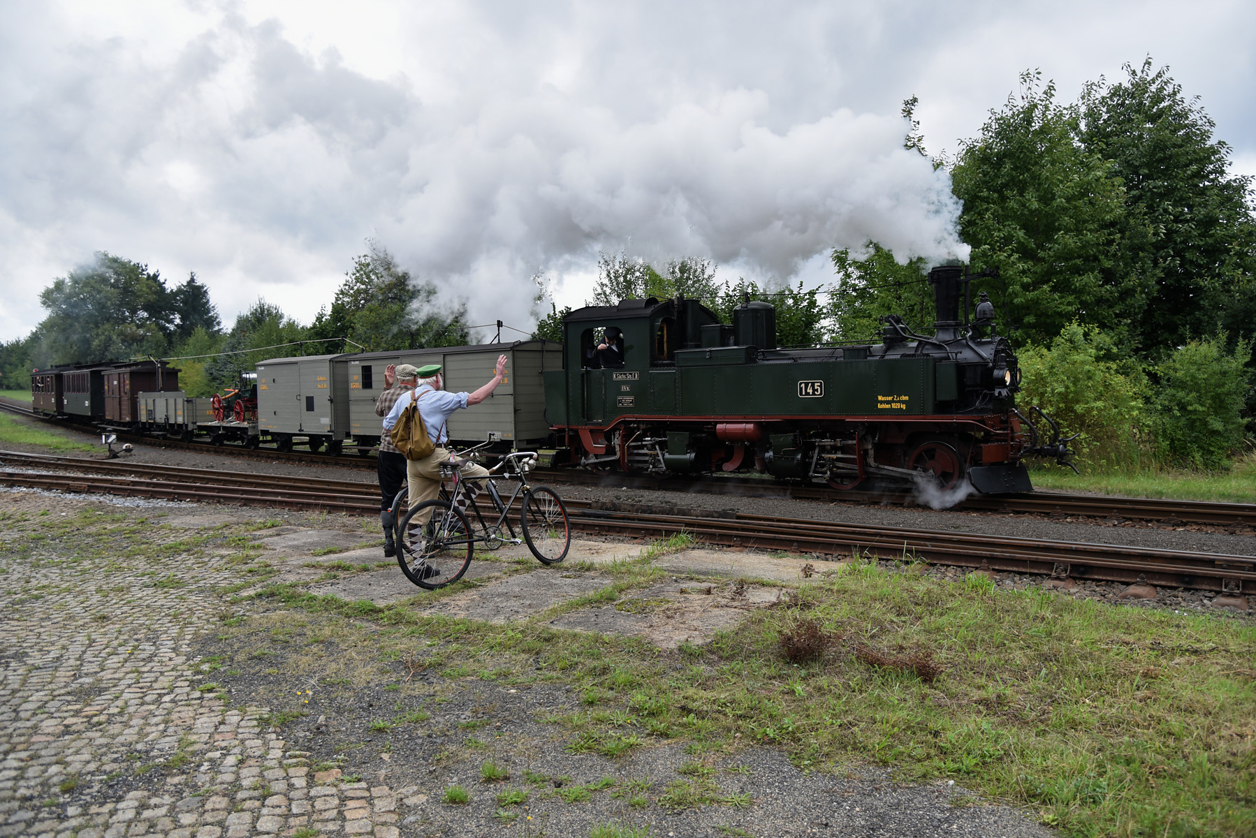 Zugfahrt mit der sächsischen Dampflok IV K Nr. 145 und einem GmP, etwas geänderte Garnitur.